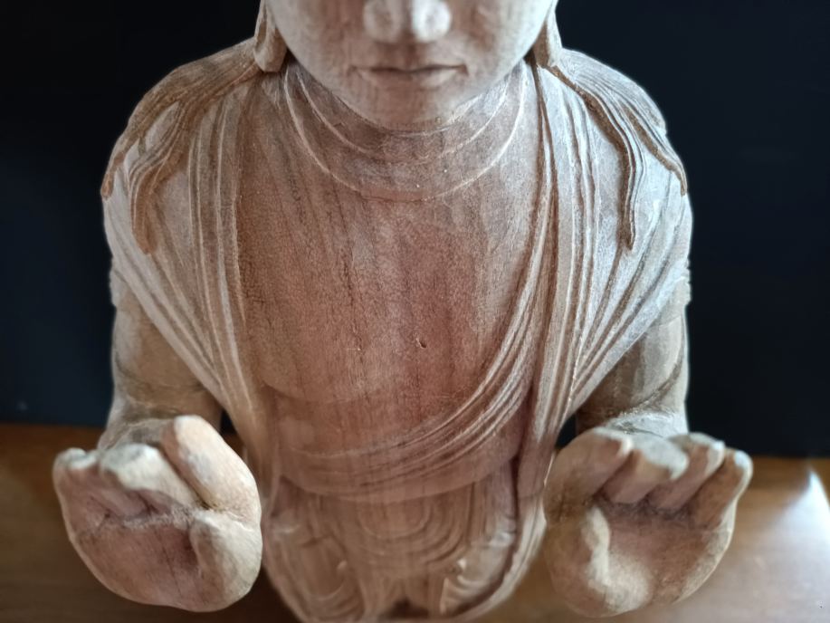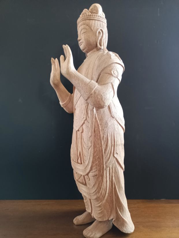 次にアマニ油蜜蝋ワックスで磨くと光沢が出て一段と仏像らしくなりました。オイルフィニッシュ(乾性油を使った木材塗装仕上げ法)は前から気になってたのですが、今回初めて使いました。クルミ油やアマニ油等の乾性油を塗る方法や、蜜蝋などでワックスがけをする方法がある中でいいところ取りのミックス方法にしました。どちらも自然素材で塗装効果はありませんが、長い年月を経ての見た目効果に期待したいと思います。長い間ご覧いただき、ありがとうございました。