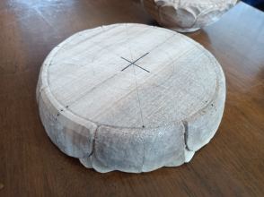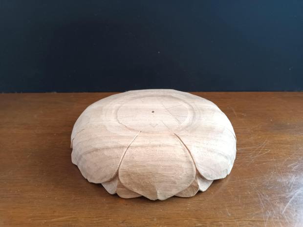 裏返して上面を彫り整えて「蓮台」としました。先の蓮台が径14cmで今回は径17cmなので3周りほど大きくなりますが、高さが少し低くなる分形状が平たくなります。
