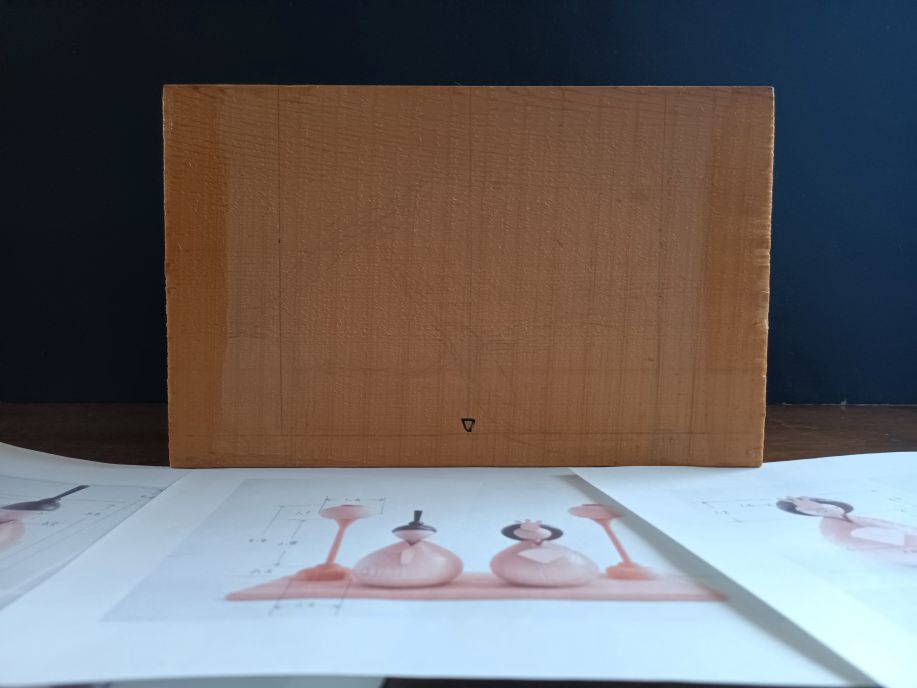 両サイドのぼんぼりとお内裏様、お雛様が台座に乗ったところです。お雛様から順に単体ごとに彫っていきたいと思います。先ずは下書きから・・・